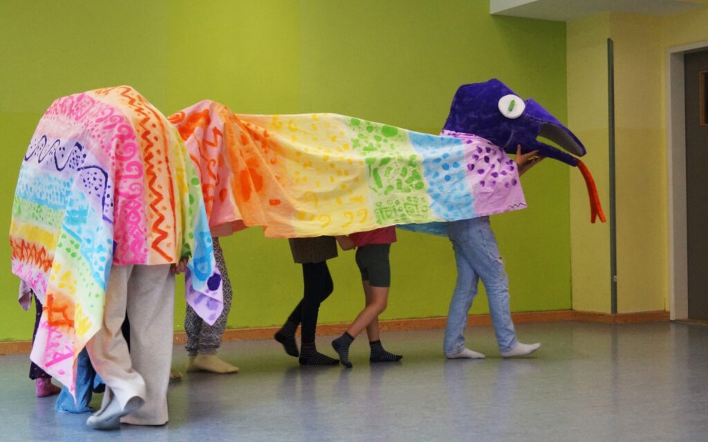 In dieser einwöchigen Projektwoche tauchten die Kinder in die Geschichten, Klänge und Bilderwelten Ozeaniens ein – aus der Perspektive der First Nations. Im Mittelpunkt standen die Regenbogenschlange (Rainbow Serpent) und das Jukurrpa (Traumzeit-Wissen), die als Ausgangspunkt für kreative Kunst- und Musikübungen dienten. Gemeinsam gestalteten die Kinder Masken, Collagen und Figuren, entdeckten rhythmische Strukturen, sangen Melodien und lernten traditionelle Kunstformen kennen. Auf spielerische Weise behandelten wir auch Themen wie Kolonialismus, Weltanschauung und gegenseitigen Respekt und zogen Verbindungen zu den eigenen Kulturtraditionen der Kinder. Am Ende präsentierten die Kinder ihre Werke – ein kollektives Regenbogenschlagen-Kostüm und eine gemeinsame Komposition – in einer kleinen Abschlussfeier.